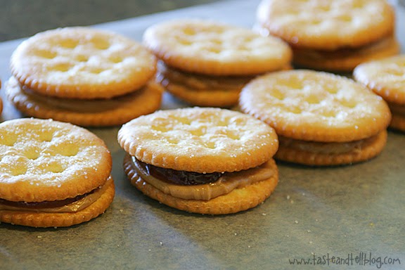 Στη μια φέτα αλείφουμε οριζόντια μαρμελάδα φράουλα, μέλι, λιωμένο marshmallow (marshmallow fluff).
